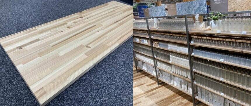 商品陳列用什器の棚板を国産木材化することで、1店舗あたり20平方メートルの国産木材を使用することが可能となるとしている。