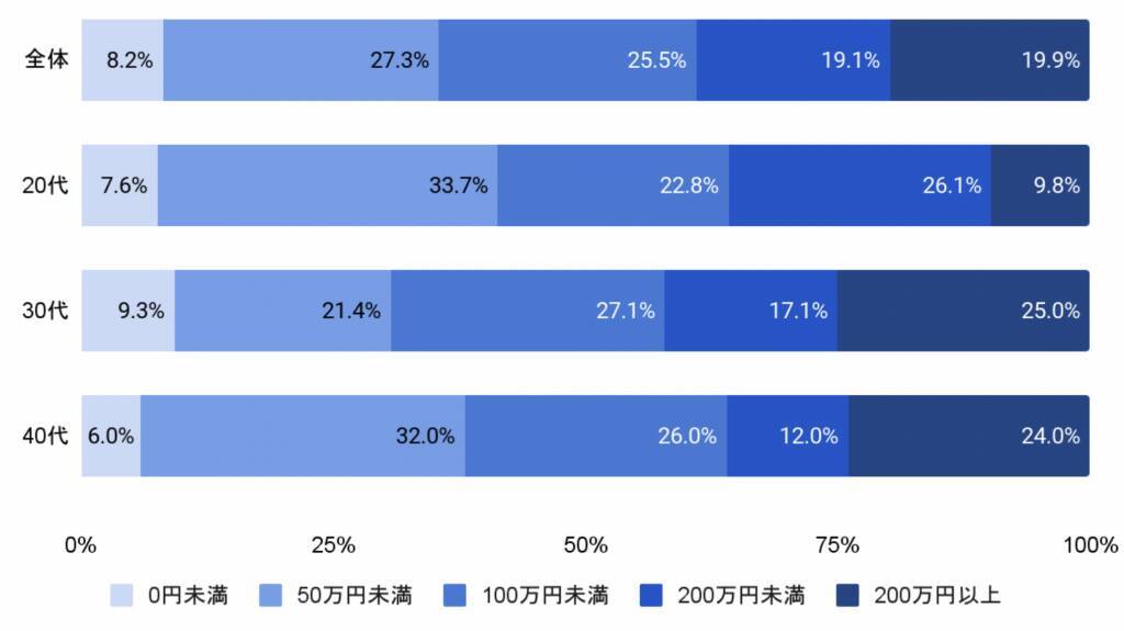 2024年に貯金した金額を聞いたところ、20代はやや低い傾向にあるが、30-40代は200万円以上と回答した人が全体の25%前後となった。一方で、50万円未満についても20代、40代が33%前後と同様に高い比率だった。