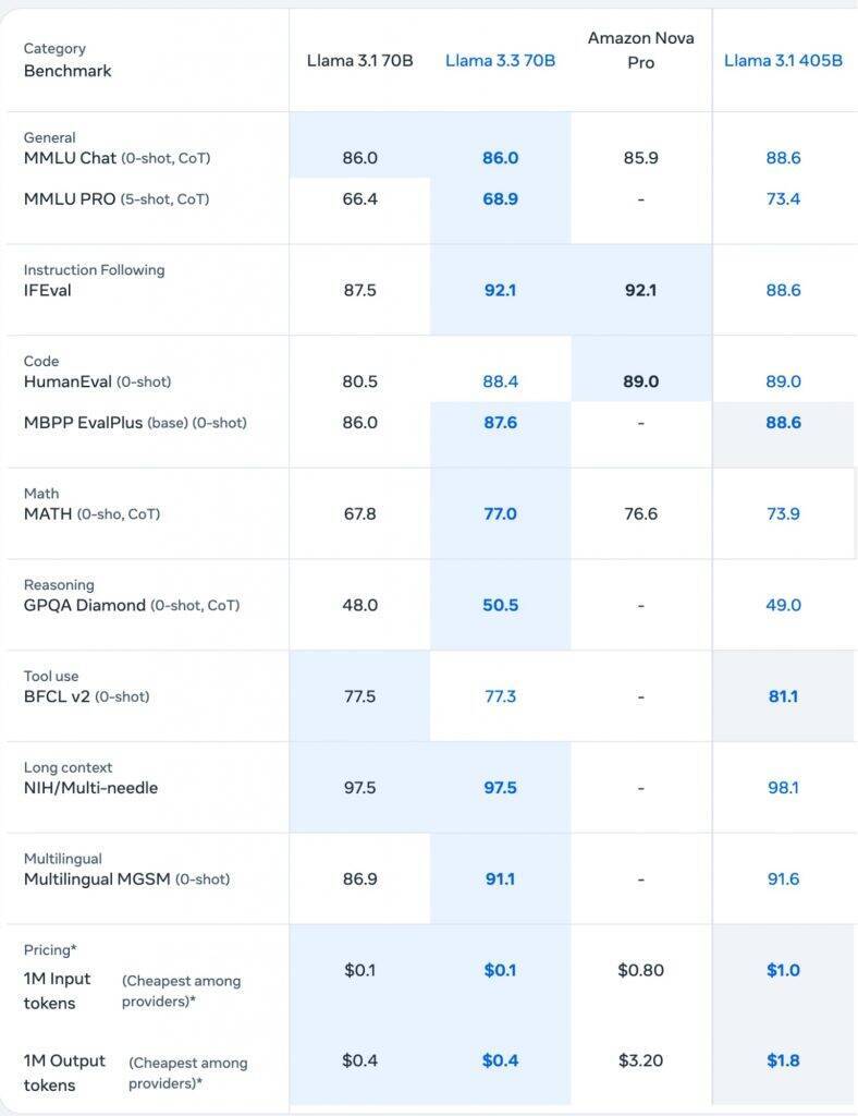Llama 3.3 70BとLlama 3.1 405Bの比較(メタウェブサイトより)