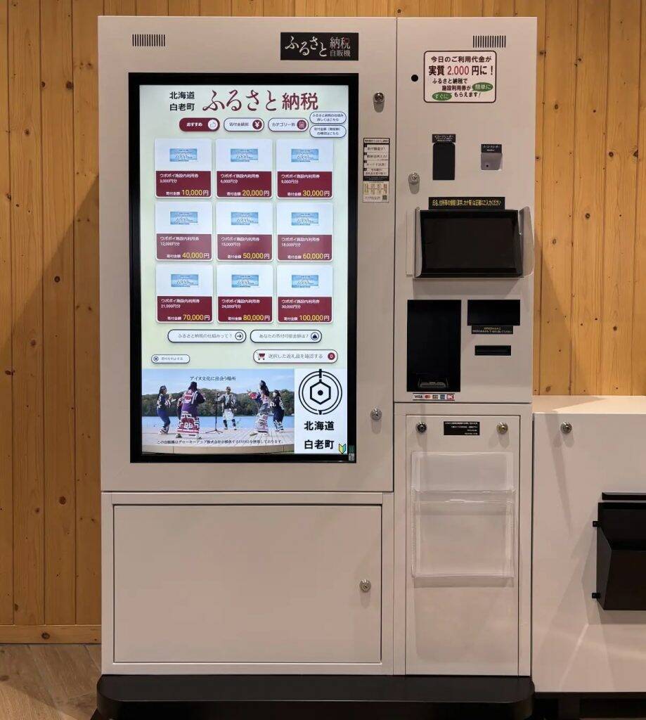 「ウポポイ」に「ふるさと納税自動販売機」設置同自販機は、利用者が白老町へのふるさと納税を行うことにより、返礼品として「ウポポイ施設内利用券」を即時に受け取れる仕組み。