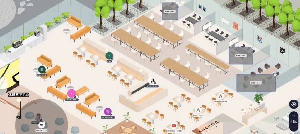 アンカー神戸、2Dメタバースバーチャル空間を開設同空間は、アンカー会員なら無料で利用でき、オンラインも含めた交流の場として活用可能。Zoomなどのオンラインツールと同様に利用できるが、毎回URLを設定する必要がないのが特徴だという。