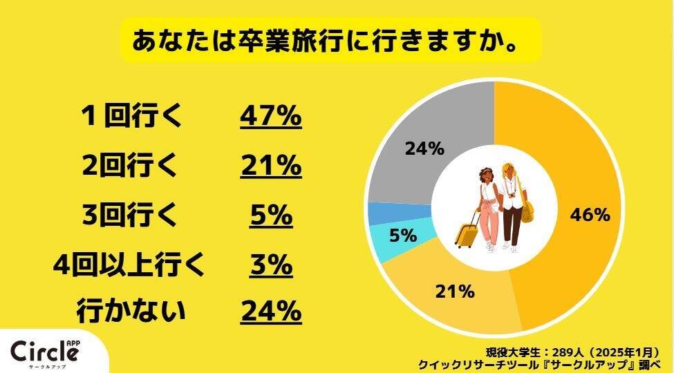 同調査では、Z世代の卒業旅行について調査を実施。現役大学生に卒業旅行に行くか聞いたところ、76%が行く、24%が行かないと回答した。行くと答えた学生のうち回数は、全体の47%が1回行く、21%が2回行く、5%が3回行く、3%が4回以上行くと回答。