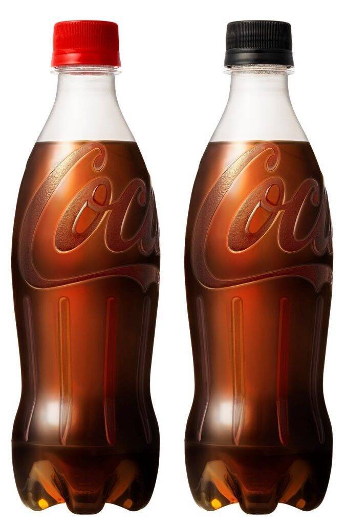 左から「コカ・コーラ ラベルレスボトル」500mlPET、「コカ・コーラ ゼロ ラベルレスボトル」500mlPETコカ・コーラは、2021年5月から100%リサイクルPETボトルを採用しており、ラベルの代わりにデボス加工によって「コカ・コーラ」のスペンサーロゴを表現しているという。