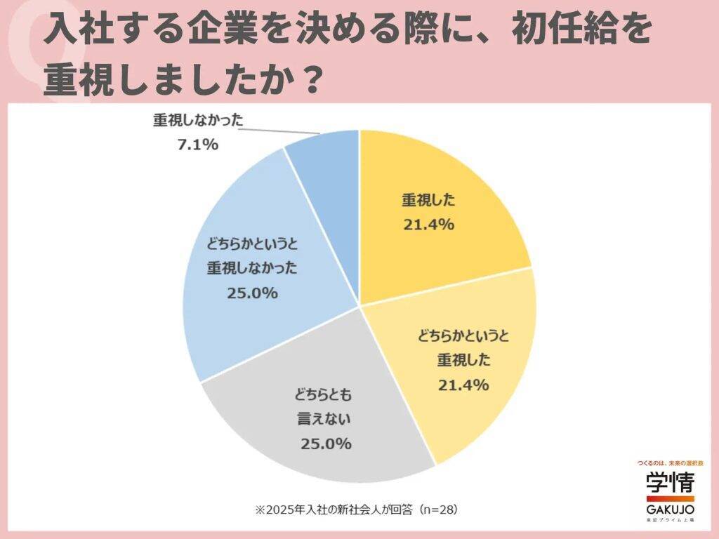 2025年入社の新社会人に、入社する企業を決める際に初任給を重視したかどうかを聞いたところ、「重視した」が21.4%。「どちらかというと重視した」も21.4%で、合わせて42.8%にのぼった。一方、「重視しなかった」は7.1%、「どちらかというと重視しなかった」は25.0%で合わせると、32.1%となった。