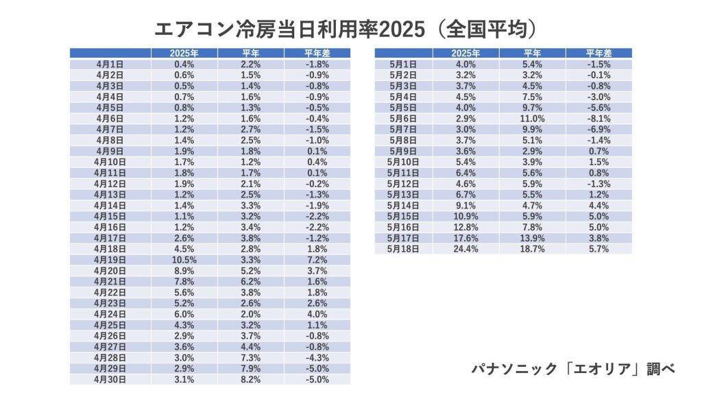 エアコン冷房を利用したユーザーの日毎の割合を示すエアコン冷房当日利用率を、4月1日~5月18日において集計。5月17日~18日の週末で大幅にエアコン冷房の利用が進み、全国で真夏日が続出した5月18日の当日利用率は24.4%と今シーズン初の20%を超える一日となったとのことだ。