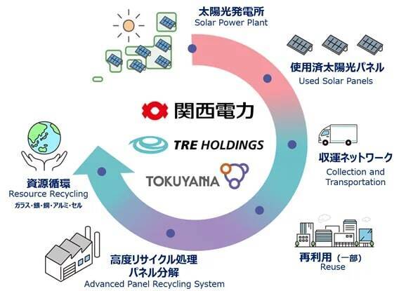 使用済太陽光パネルの資源循環イメージこの協定は、各社の知見やノウハウ、ネットワークを活用し、トクヤマが保有する低温熱分解リサイクル技術を基盤とした太陽光パネルの水平リサイクルを柱にした事業モデルの構築を目的としているという。