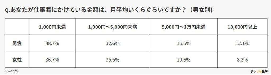 1万円以上の高価格帯を選んだ人もフルリモート勤務者に比べて倍近いなど、フル出社する人たちは、服装にもある程度の投資をしている傾向がうかがえた。