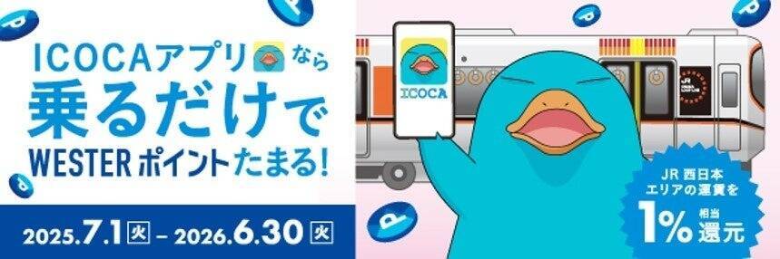 「ICOCAアプリなら乗るだけでWESTERポイントたまる!」キャンペーン同キャンペーンでは、2025年7月1日から2026年6月30日までの間に、ICOCAアプリでJR西日本エリア内の鉄道に乗車すると、運賃の1%相当をWESTERポイントとして翌月末以降に付与するとのことだ。