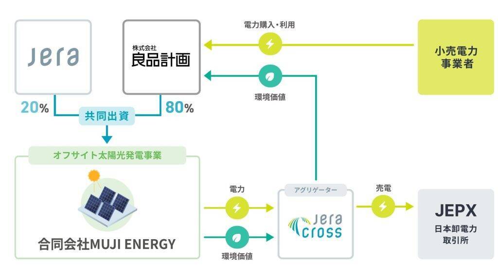 同契約を通じて、MUJI ENERGYが太陽光発電から創出した環境価値はJERA Crossを通じて、良品計画が運営する無印良品のテナント店舗などの電力由来のCO2排出量削減に活用されるとのことだ。