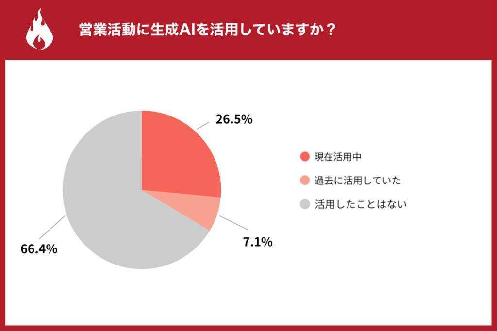 営業活動において生成AIを活用しているか聞いたところ、「現在活用中」が26.5%、「過去に活用していた」が7.1%という結果となった。一方で、「活用したことはない」と回答した人が66.4%と最多であり、営業活動における生成AIの活用はまだ限定的であることがわかった。「営業活動に生成AIを活用しているか?」(n=1,000)