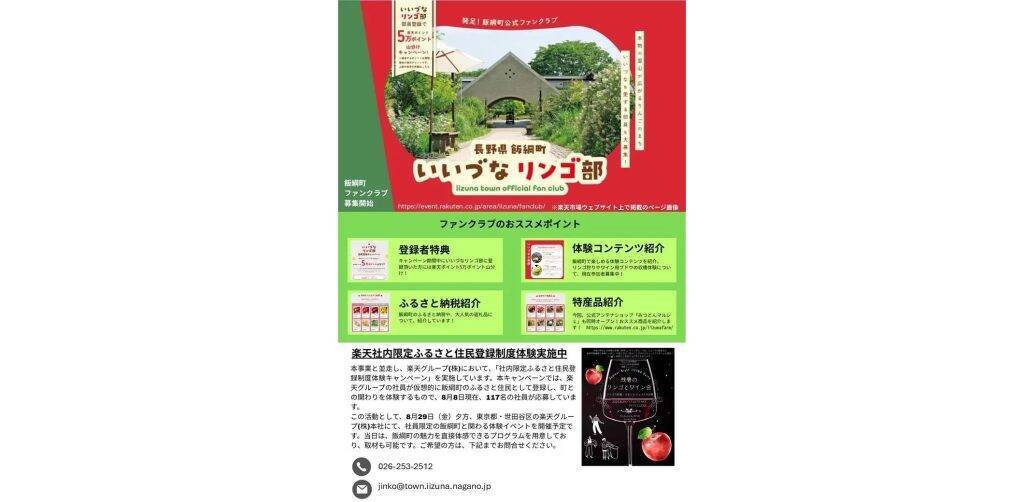 さらに、楽天グループの社内で、「社内限定ふるさと住民登録制度体験キャンペーン」を実施するという。同キャンペーンは、同社社員が仮想的に飯綱町のふるさと住民として登録し、町との関わりを体験するものとなっている。