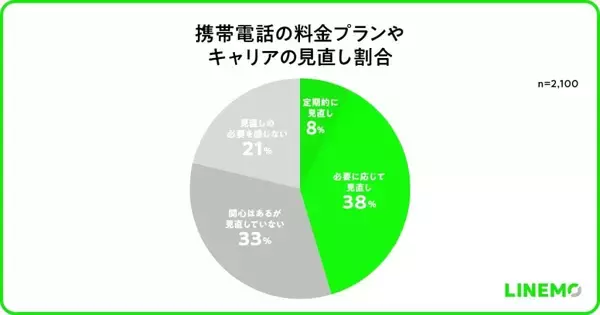 同調査によると、携帯電話料金が「高い」と感じている人は60%に上ったが、料金プランやキャリアの見直しを「定期的に行っている」と答えた人は8%、「必要に応じて見直している」は38%で、合計46%にとどまった。携帯電話の料金プランやキャリアの見直し割合見直しを行っていない理由としては、「手続きが面倒」(34%)、「料金プランが複雑で分かりづらい」(31%)、「店舗に行くのが億劫」(24%)といった心理的・手続き上のハードルが上位を占めた。