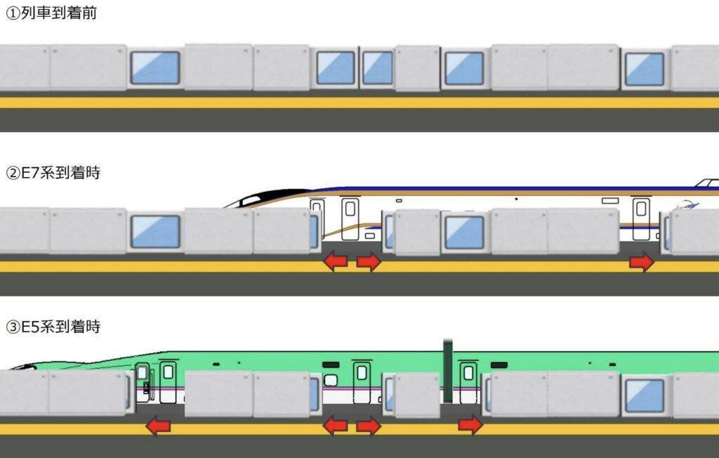 新幹線東京駅 ホームドア設置イメージ今回導入されるホームドアは、新幹線では世界初となる、車両ごとに異なるドア位置に自動対応できる新型。E2系、E5系・H5系、E6系、E7系・W7系、E8系、E5系+E6系・E8系などの多様な編成に対応可能なレイアウトを採用し、編成ごとに車両ドアの位置を自動認識し、それに合わせてホームドアを開扉する機能を備えるという。