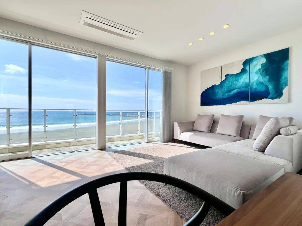 立地は、国道134号線沿い、サザンビーチ徒歩1分の海側で、「茅ヶ崎サザンCモニュメント」まではわずか50メートルの場所に位置する。ベベランダやテラスからは、烏帽子岩・江の島・相模湾を一望でき、まるで“海と暮らす”ような非日常を体験できるという。