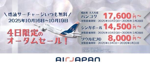 また、搭乗期間を通常よりもさらに長く設定し、バンコク線とシンガポール線は現在販売している2025年冬ダイヤ期間の最終日(2026年3月28日)までと、休み期間までを対象搭乗期間として設定。最大約5カ月間の旅行がセールの対象となるとしている。