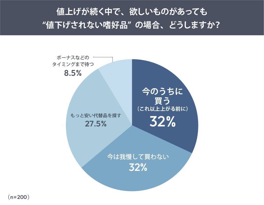 今回の調査では、値下げされない嗜好品を「今のうちに買う」と回答した人が32%に上り、「今は我慢して買わない」と答えた人と並ぶ結果となった。一方で、「ボーナスなどのタイミングまで待つ」と回答した人は8.5%にとどまり、“ボーナスを待ってから買う”という従来の購買スタイルが少数派となっていることが判明。