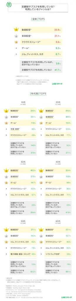 10代では「学習・教育」が4位に入った一方で、20代以上では「ジム、フィットネス、ヨガ」も5位以内にランクインした。全体として動画や音楽を中心に20~30代の定額制サブスクの利用率が最も高いことが明らかになった。