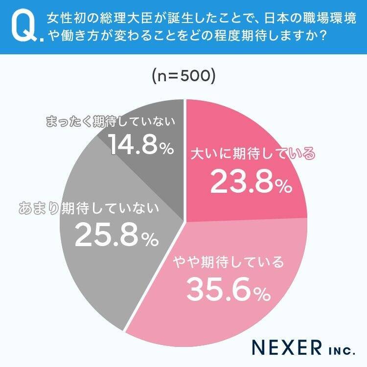 まずは女性初の総理大臣が誕生したことで、日本の職場環境や働き方が変わることをどの程度期待するかを調査。女性初の総理誕生に対し、職場環境や働き方が変わることを「大いに期待している」が23.8、「やや期待している」が35.6%で合わせると59.4%でという結果に。