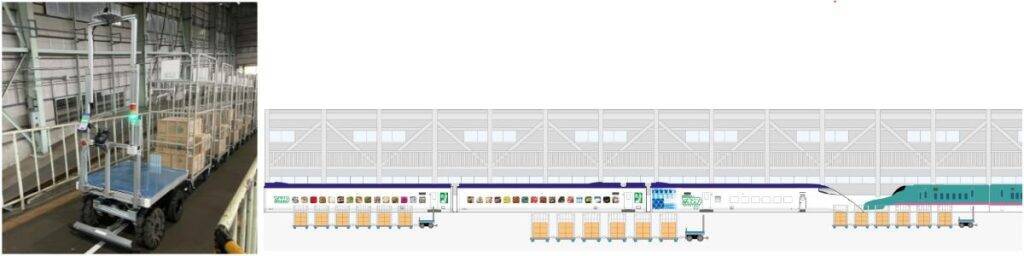 左から、AGV、AGVによる作業イメージ今後「はこビュン」は、仙台や新潟エリアへの拡大も視野に入れているという。