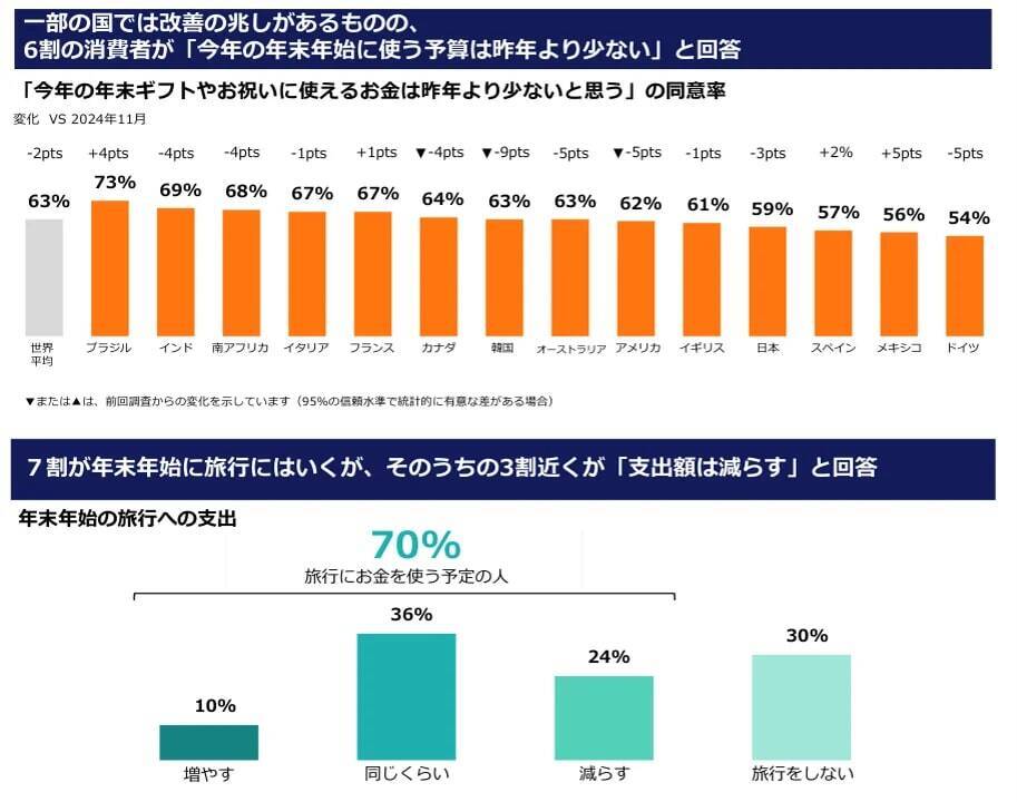 調査によると、15カ国の平均で60%以上の生活者が「今年の年末予算は昨年より少ない」と回答した。年末年始のギフトやお祝いに充てる予算を減らす傾向がみられ、全体的に節約志向が続いているとしている。一部の国では改善傾向がみられるものの、多くの消費者が依然として「家計の引き締め」を意識していると分析している。