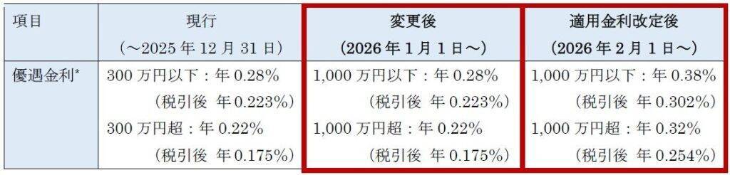また、2026年2月1日より、「マネーブリッジ」の優遇金利を改定。これにより、2026年2月1日以降、1,000万円以下の部分は、年0.38%(税引後0.302%)の優遇金利が適用となるとのことだ。