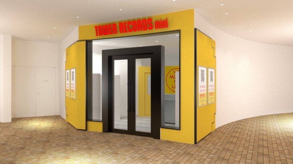 TOWER RECORDS mini 舞浜イクスピアリ店 エントランスイメージ今回新しくオープンする「TOWER RECORDS mini 舞浜イクスピアリ店」は、既存店のなかで最も小さいTOWER RECORDS mini もりのみやキューズモール店よりも、さらにコンパクトな面積9.93坪の超小型店舗だという。