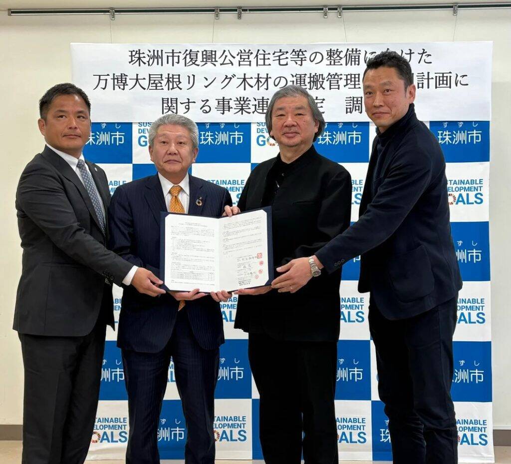 MUIC Kansaiら4者が運搬管理・活用計画で協定締結協定は、大屋根リングの木材を復興公営住宅の建設資材として再活用する取り組みで。