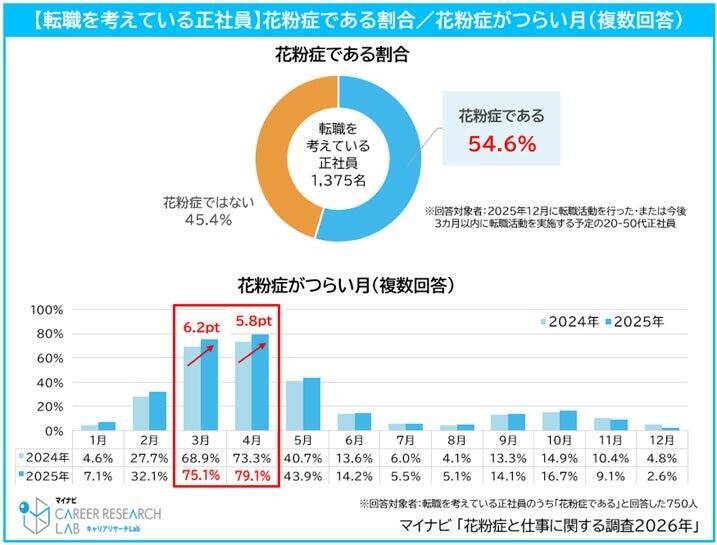 転職を考えている20~50代の正社員のうち、「花粉症」の割合は54.6%となり、2人に1人以上が「花粉症」であることがわかった。特に「花粉症」がつらい月を聞くと、4月(79.1%)が最多となり、次いで3月(75.1%)だった。