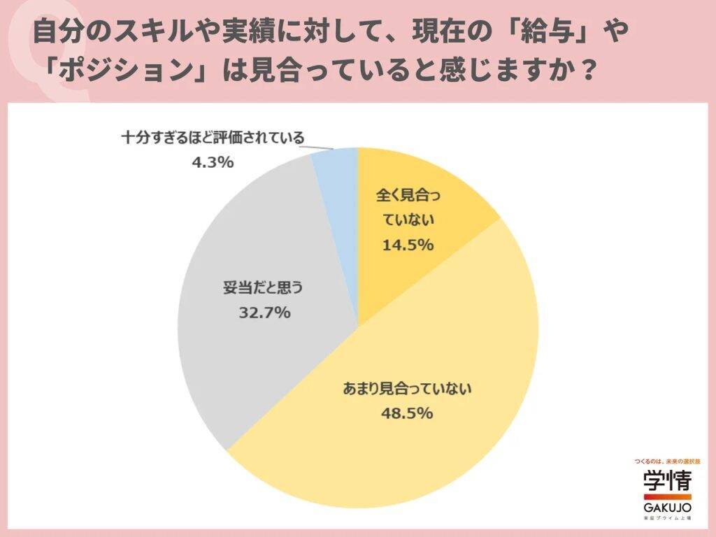 同調査では、自分のスキルや実績に対して現在の給与やポジションが見合っているかを尋ねたところ、「全く見合っていない」14.5%と「あまり見合っていない」48.5%を合わせた63.0%が「見合っていない」と回答した。
