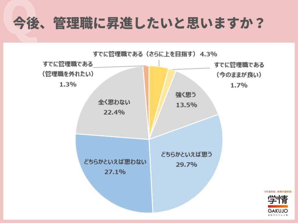 20代後半から30代の転職希望者に、今後、管理職に昇進したいと思うかを尋ねたところ、「強く思う」13.5%、「どちらかといえば思う」29.7%に、「すでに管理職である(さらに上を目指す+今のままが良い)」を合わせると計49.2%という結果に。これに対し、「全く思わない」22.4%、「どちらかといえば思わない」27.1%と「すでに管理職である(管理職を外れたい)」の合計が50.8%。