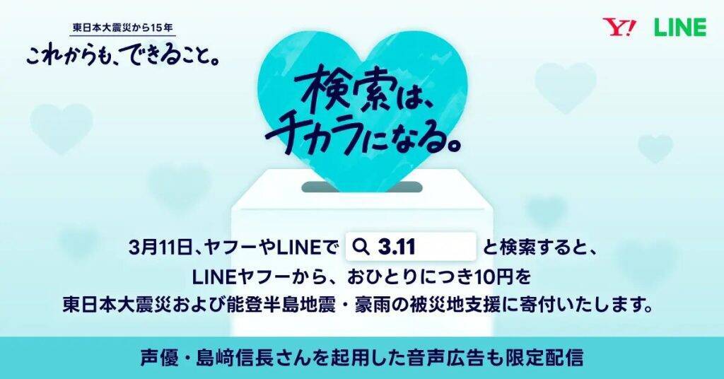 同企画のなかで、3月11日に「3.11 検索は、チカラになる。」を実施。3月11日0時00分~23時59分の間に、「Yahoo! JAPAN」もしくは「LINE」のニュースタブ上部の検索窓で「3.11」と検索したユーザーひとりにつき10円を、東日本大震災および能登半島地震・豪雨の被災地支援に取り組む団体へLINEヤフーが寄付するという(※2)。
