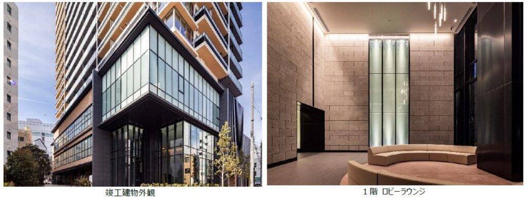 建物内では、2層吹き抜けのロビーラウンジに高さ約6.7メートルの空間を設け、カーテンウォールを採用。エレベーターホールへ至るアプローチには、灯籠をイメージしたガラスを壁面左右に設置した。光の回廊を表現し、柔らかな光が木漏れ日のように空間を照らす設計だとしている。