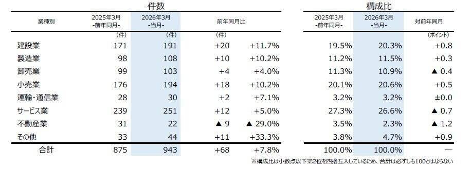 業種別にみると、7業種中6業種で前年を上回った。「サービス業」(前年同月239件→251件、5.0%増)が最も多く、2025年7月(263件)に次ぎ2000年以降で過去2番目に多くなっている。「小売業」(同176件→194件、10.2%増)は3カ月連続で前年を上回り、「建設業」(同171件→191件、11.7%増)は前年を上回って2025年度で最多となった。また、「製造業」(同98件→108件、10.2%増)は2カ月ぶりに前年を上回り、3月としては過去10年で最も多い結果に。