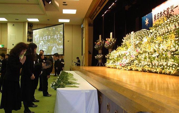 東日本大震災から1年 千葉県と旭市が合同で行った「東日本大震災1周年追悼式」で、鎮魂の思いを込めて手を合わせる遺族ら=2012年3月11日、旭市横根の「いいおかユートピアセンター」 写真提供:産経新聞社