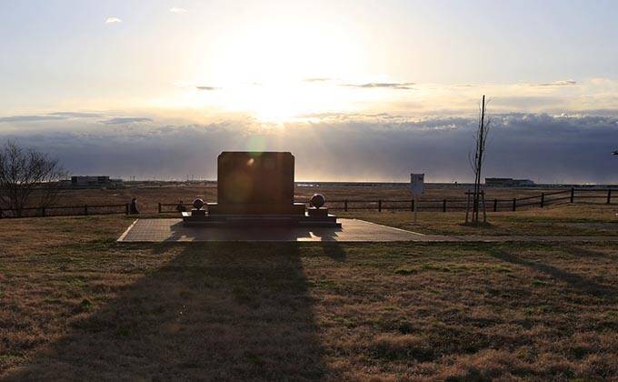 津波被害の大きかった福島県浪江町請戸地区。高台に建てられた慰霊碑に朝日が昇る=2020年3月11日午前6時32分 写真提供:共同通信社