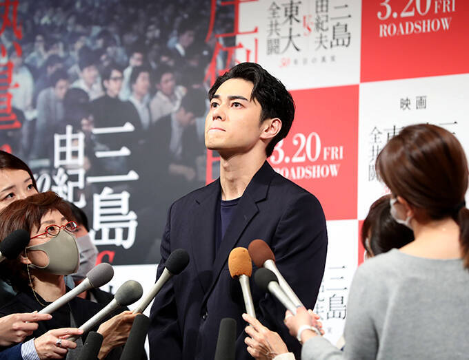 「三島由紀夫VS東大全共闘 50周年の真実」公開直前トークイベントを終え、囲み取材に応じる東出昌大。質問に困る様子を何度も見せた=2020年3月17日 東京都港区 写真提供:産経新聞社