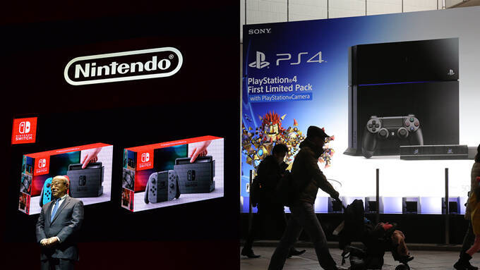 (左)「Nintendo Switch」を発表する任天堂の君島達己・代表取締役社長 =東京都江東区 撮影日:2017年01月13日/(右)「PS4」が日本で販売開始。ショールームに展示前の大きな屋外広告で盛り上げる=2014年2月21日、東京都中央区の銀座ソニービル (写真提供:ともに産経新聞社)