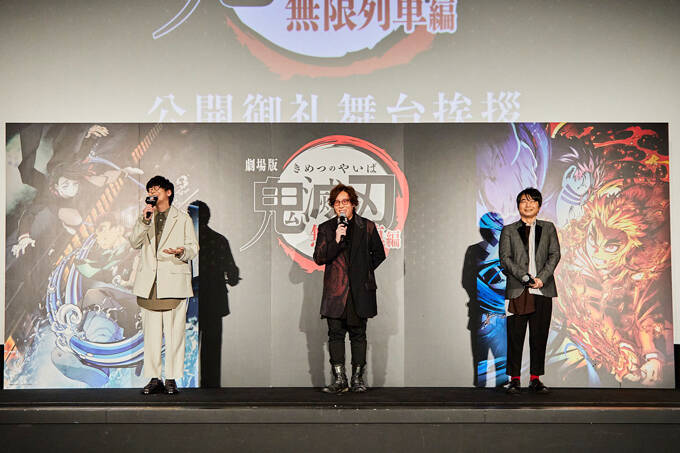 まだまだその勢い留まるところを知らない『劇場版「鬼滅の刃」無限列車編』。劇場へ足を運び、「鬼滅の刃」を応援する観客に感謝を伝えるべく、主人公・竈門炭治郎役の花江夏樹、煉獄杏寿郎役(※2)の日野聡、そして公開後大きな話題を呼んでいる猗窩座役の石田彰が本作のイベントに初集結、公開御礼舞台挨拶が行われた。