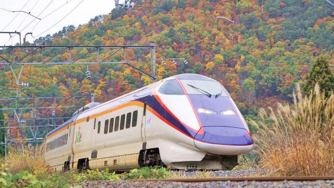 E3系新幹線電車の塗色は、“カラフルな山肌にも負けまい”と存在感を示すかのよう。