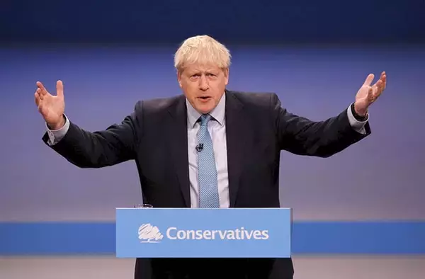 英中部マンチェスターでの与党保守党大会で演説するジョンソン首相=2019年10月2日(ロイター=共同) 写真提供:共同通信社