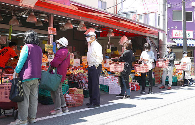【新型コロナ】スーパー「アキダイ」で開店前に並ぶ客=2020年4月25日、東京都練馬区 写真提供:産経新聞社