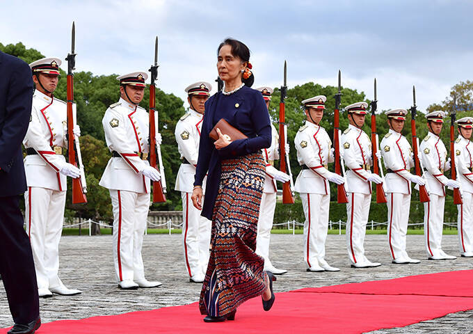 政治 日本・メコン地域諸国首脳会議 栄誉礼を受けるミャンマーのアウン・サン・スー・チー国家顧問=2018年10月9日午前、東京・元赤坂の迎賓館 写真提供:産経新聞社