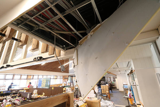 震度6強の揺れで天井が落ちかかった道の駅=2021年2月14日、福島県国見町 写真提供:産経新聞社