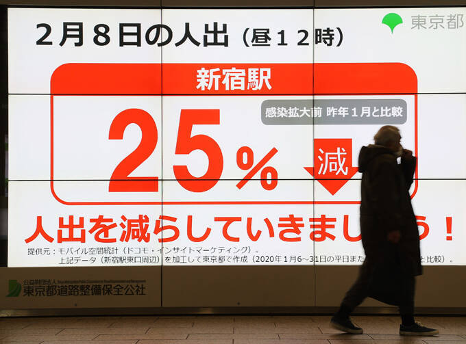 新型コロナ/昼間の人出の増減を示す電子看板 東京都は新型コロナウイルス対策として、昨年1月と比べた昼間の人出の増減率を、新宿駅など都内主要4駅の電子看板(デジタルサイネージ)で示す取り組みを始めた。=2021年2月8日午後、東京都新宿区 写真提供:時事通信社