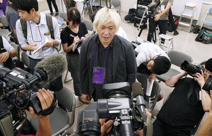 「表現の不自由展・その後」実施団体の抗議声明を受け、記者の質問に答える「あいちトリエンナーレ2019」芸術監督の津田大介氏=2019年8月3日夜、名古屋市 写真提供:共同通信社