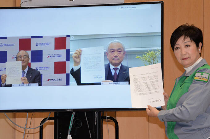 新型コロナウイルス対策に関する共同宣言をした(左から)三村明夫東京商工会議所会頭、尾崎治夫東京都医師会長(ともにスクリーン上)、小池百合子東京都知事=2021年2月16日、東京都庁