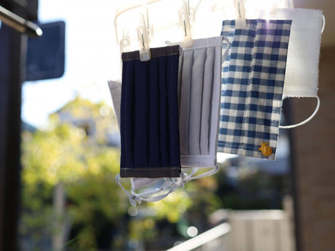 マスクの場合、繰り返し洗って使える布マスクは手洗いが基本です。そして洗ったあと、陰干しで自然乾燥します。その際、マスクのゴムの部分を洗濯バサミで留めている方、いらっしゃるかも知れませんが、これはゴムが伸びてしまう場合があります。マスク本体を洗濯バサミで留める干し方が良いそうです。