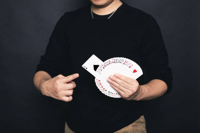マジックは会場の大きさやお客さんの人数などによって、いくつもの種類に分けられます。例えば「クロースアップマジック」。テーブルを挟んで、少人数のお客さんの前で披露します。お客さんは見るだけでなく、参加する楽しみもあります。