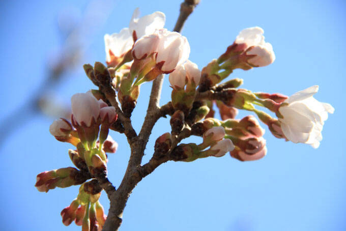 桜の「開花」の条件ですが、標本木のつぼみのうち、“5輪から6輪の花が咲いた状態”です。そして、「満開」の条件は“8割以上のつぼみが開いた状態”です。