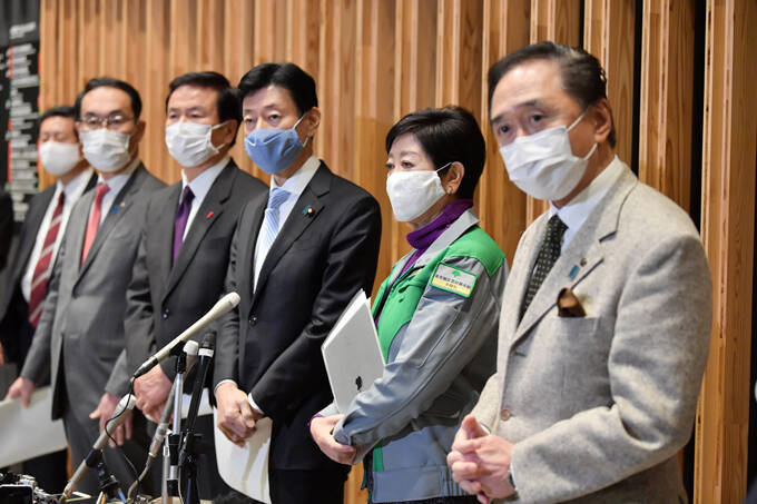 面談後、報道陣の取材に応じる(右から)神奈川県の黒岩祐治知事、小池百合子都知事、西村康稔経済再生担当相、千葉県の森田健作知事、埼玉県の大野元裕知事=2021年01月02日午後、東京都千代田区 写真提供:産経新聞社